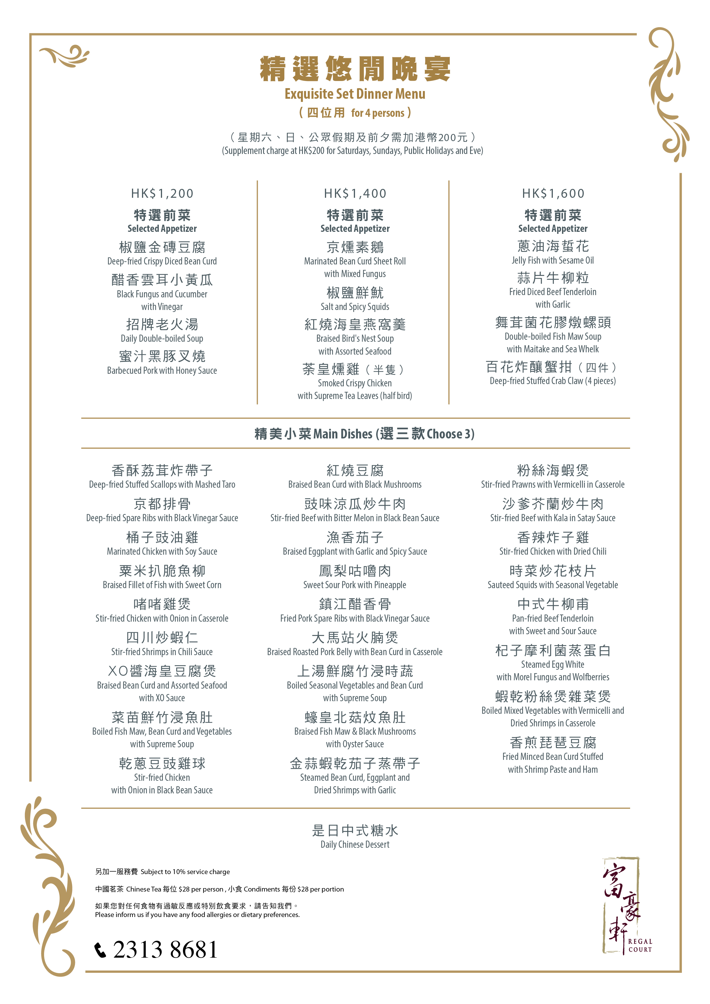 Exquisite Set Dinner Menu- Prices are subject to tea, condiment and 10% service charge