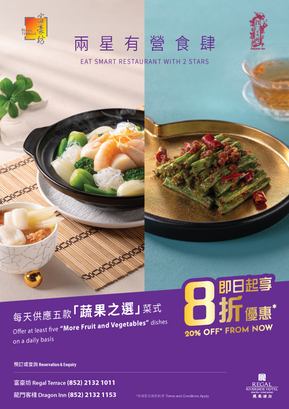 富豪坊及龙门客栈有幸获选为两星有营食肆,现每天供应共5款指定「蔬果之选」菜式,更享8折优惠,有「营」尽在丽豪。